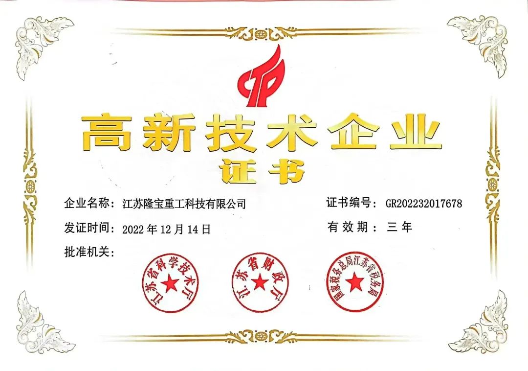 喜報(bào)!??!丨江蘇隆寶重工科技有限公司獲得高新技術(shù)企業(yè)證書(shū)